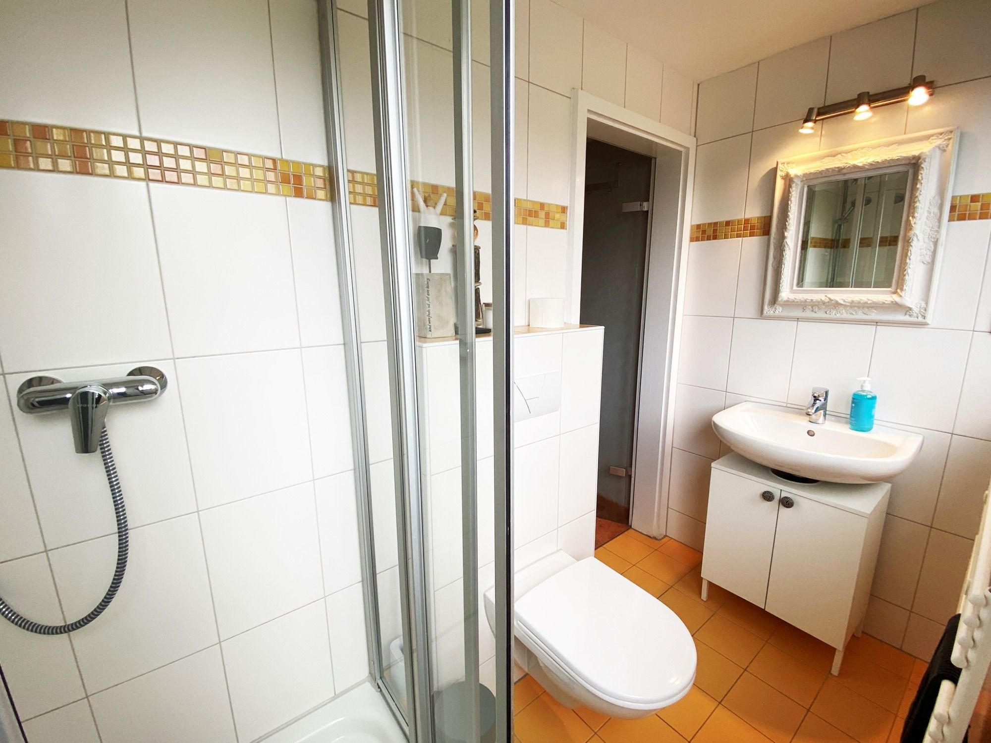 Im Erdgeschoß befinden sich Wohnzimmer, Diele und Küche. Dann in der zweiten Etage haben Sie Ihr Bad mit Dusche und das Schlafzimmer ins Grüne.