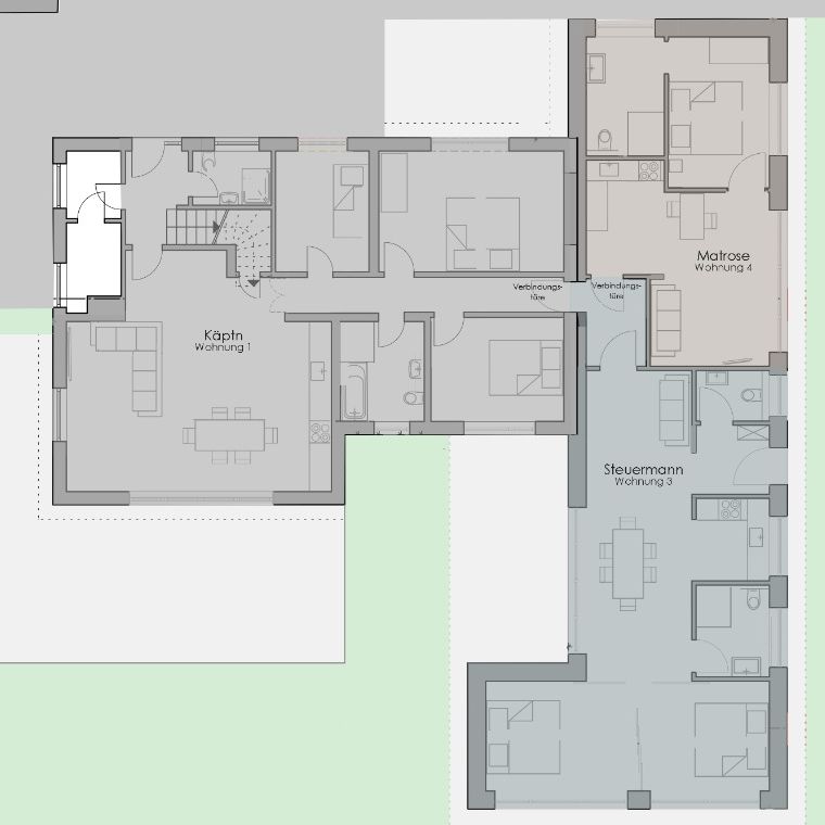 4 Wohnungen, alle unter einem Dach. Jedes Apartment für sich ist ein eigenes Zuhause, öffnet man die Zwischentüren schon ist man zusammen.